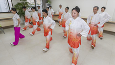 在銘傳高級(jí)中學(xué)的體育館外,志愿者扶一位老人上樓梯(7月19日手機(jī)拍攝)。 新華社記者 陳諾 攝