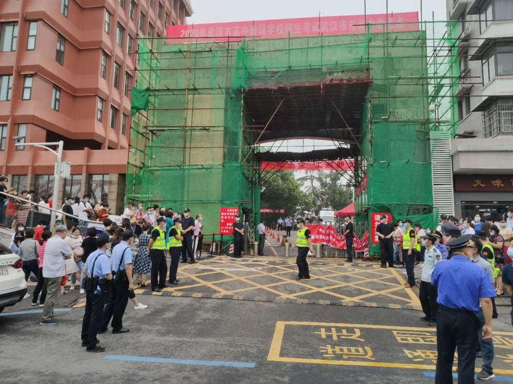 記者在武漢東湖中學(xué)考點(diǎn)門前看到,交警、民警、水務(wù)、電力、城管等多個(gè)部門工作人員嚴(yán)陣以待,以高考標(biāo)準(zhǔn)迎接考生進(jìn)場(chǎng)。
