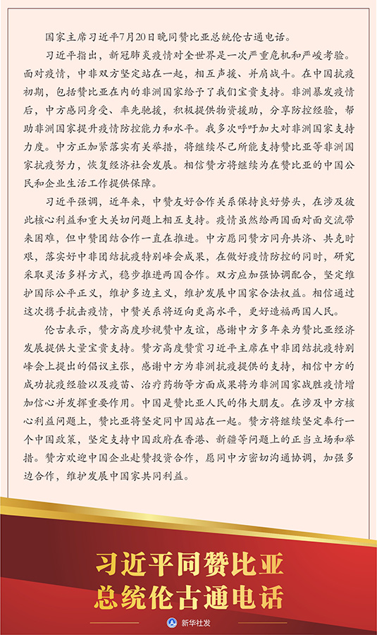習(xí)近平強(qiáng)調(diào),近年來,中贊友好合作關(guān)系保持良好勢頭,在涉及彼此核心利益和重大關(guān)切問題上相互支持。疫情雖然給兩國面對面交流帶來困難,但中贊團(tuán)結(jié)合作一直在推進(jìn)。中方愿同贊方同舟共濟(jì)、共克時(shí)艱,落實(shí)好中非團(tuán)結(jié)抗疫特別峰會成果,在做好疫情防控的同時(shí),研究采取靈活多樣方式,穩(wěn)步推進(jìn)兩國合作。雙方應(yīng)加強(qiáng)協(xié)調(diào)配合,堅(jiān)定維護(hù)國際公平正義,維護(hù)多邊主義,維護(hù)發(fā)展中國家合法權(quán)益。相信通過這次攜手抗擊疫情,中贊關(guān)系將邁向更高水平,更好造福兩國人民。