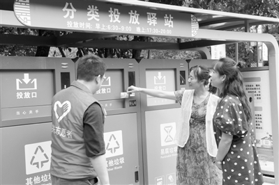 在金華市金東區(qū)的每個垃圾投放點(diǎn)附近,都有一名垃圾巡檢員會協(xié)助居民做好分類,定時、定點(diǎn)投放垃圾。