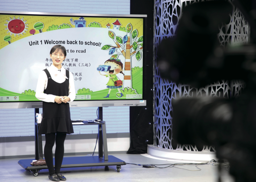 2月17日,寧夏銀川市金鳳區(qū)實驗小學(xué)教師楊玉燕在錄制“空中課堂”四年級英語課程(楊植森/攝)
