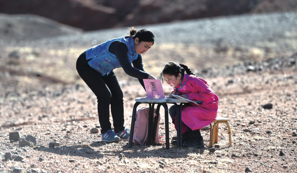 4月1日,內(nèi)蒙古自治區(qū)阿拉善左旗蒙古族學(xué)校四年級(jí)學(xué)生策耿(右)在家附近的戈壁上上網(wǎng)課(劉磊/攝)