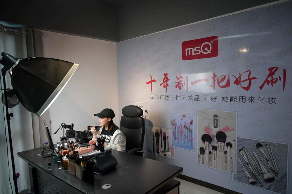 5月15日,在江西省南昌市青山湖區(qū)一家電商企業(yè)的直播間內(nèi),主播線上直播銷售化妝刷。新華社記者 彭昭之 攝