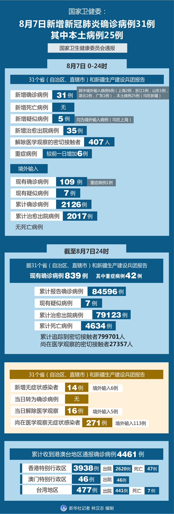 截至8月7日24時(shí),據(jù)31個(gè)?。ㄗ灾螀^(qū)、直轄市)和新疆生產(chǎn)建設(shè)兵團(tuán)報(bào)告,現(xiàn)有確診病例839例(其中重癥病例42例),累計(jì)治愈出院病例79123例,累計(jì)死亡病例4634例,累計(jì)報(bào)告確診病例84596例,現(xiàn)有疑似病例7例。累計(jì)追蹤到密切接觸者799701人,尚在醫(yī)學(xué)觀察的密切接觸者27357人。