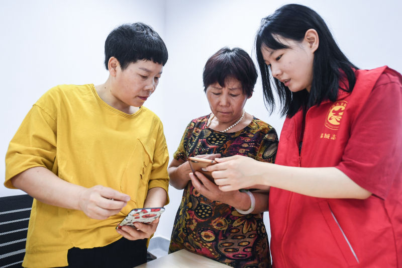 6月4日,在杭州市臨安區(qū)錦城街道勝利社區(qū),青年社工指導(dǎo)老人們用手機(jī)購物 徐昱/攝