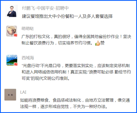 總書記強調,要加強立法,強化監(jiān)管,采取有效措施,建立長效機制,堅決制止餐飲浪費行為。網友們就此積極獻計獻策。