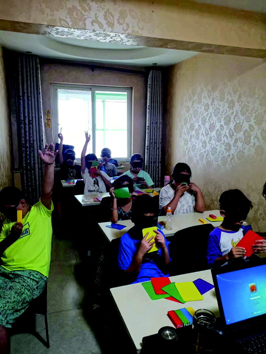 某培訓(xùn)機(jī)構(gòu)讓孩子蒙著眼睛感知顏色。 本報(bào)記者王菲菲攝