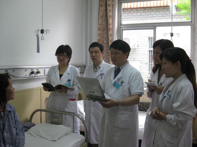 中國醫(yī)學科學院腫瘤醫(yī)院徐兵河教授(右三)、馬飛教授(右四)攜治療團隊在病房查問乳腺癌患者康復情況。圖片由受訪者提供