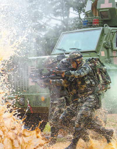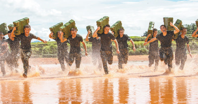 中隊官兵扛著彈藥箱在泥水中訓(xùn)練沖刺。本報記者 金 歆攝