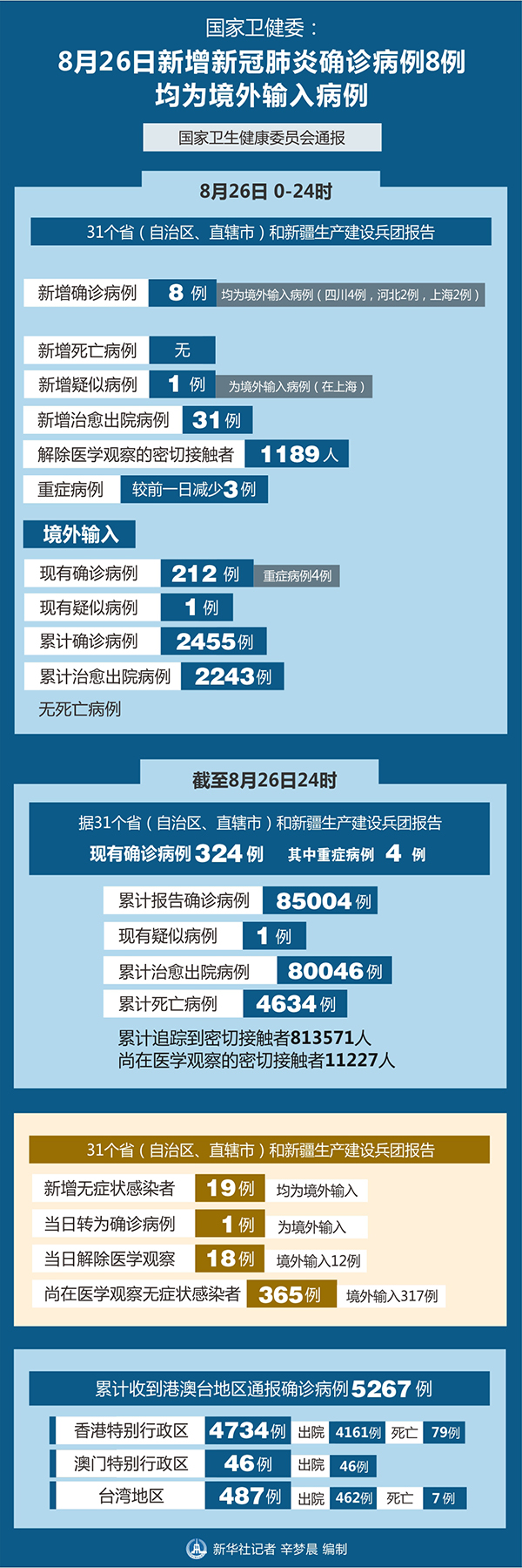 新華社北京8月27日電? 國(guó)家衛(wèi)健委27日通報(bào),8月26日0—24時(shí),31個(gè)省(自治區(qū)、直轄市)和新疆生產(chǎn)建設(shè)兵團(tuán)報(bào)告新增確診病例8例,均為境外輸入病例(四川4例,河北2例,上海2例);無(wú)新增死亡病例;新增疑似病例1例,為境外輸入病例(在上海)。