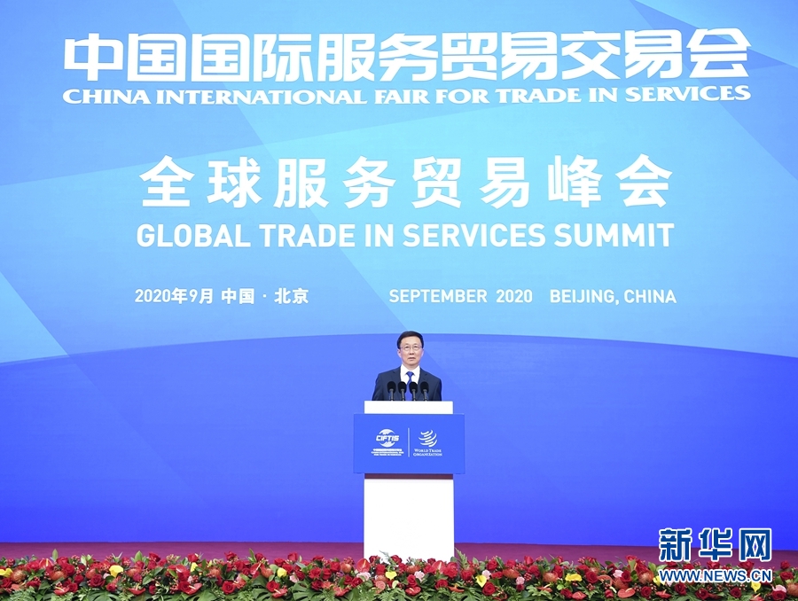 9月4日,中共中央政治局常委、國務(wù)院副總理韓正在北京出席2020年中國國際服務(wù)貿(mào)易交易會全球服務(wù)貿(mào)易峰會并宣布服貿(mào)會開幕。 新華社記者 燕雁 攝