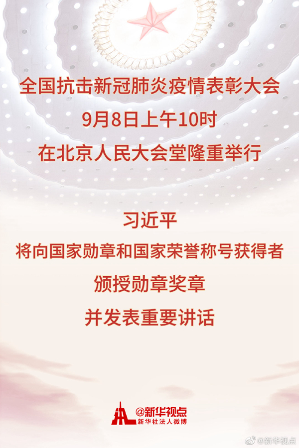 新華社北京9月6日電? 全國抗擊新冠肺炎疫情表彰大會將于9月8日上午10時在北京人民大會堂隆重舉行。中共中央總書記、國家主席、中央軍委主席習(xí)近平將向國家勛章和國家榮譽稱號獲得者頒授勛章獎?wù)虏l(fā)表重要講話。