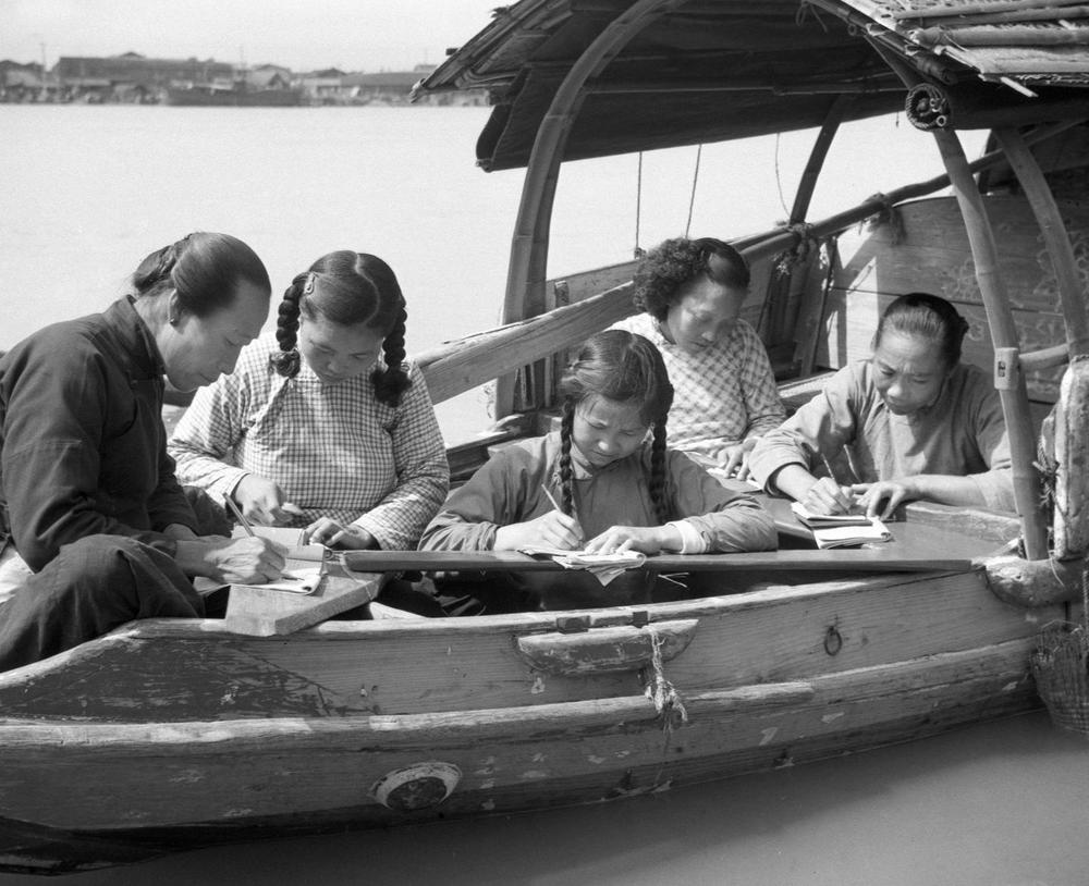 ↑ 1958年,福建省福州市生活在水上的婦女在船頭練習(xí)寫(xiě)字。解放前,福州市的水上居民中婦女100%都是文盲。解放后,她們走進(jìn)了識(shí)字班,在當(dāng)?shù)匦W(xué)教師的輔導(dǎo)下開(kāi)展掃盲學(xué)習(xí)。