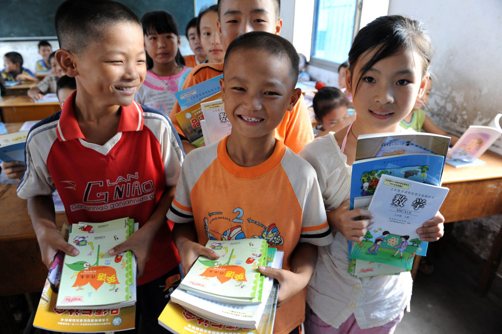 ↑ 這是2008年9月1日,江西樟樹(shù)市第二小學(xué)五(1)班鄧文?。ㄖ校┑韧瑢W(xué)領(lǐng)到免費(fèi)教科書(shū)。