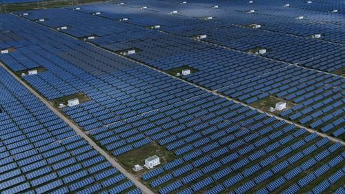 青海省海南藏族自治州共和縣塔拉灘光伏電站(8月17日攝,無(wú)人機(jī)照片)。新華社記者 張龍 攝