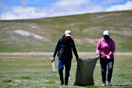 在青海省果洛藏族自治州瑪多縣瑪查理鎮(zhèn)噶丹村,生態(tài)管護(hù)員索南吉(右)與才讓多杰在村子周邊的草原上撿垃圾(8月19日攝)。新華社記者 張龍 攝