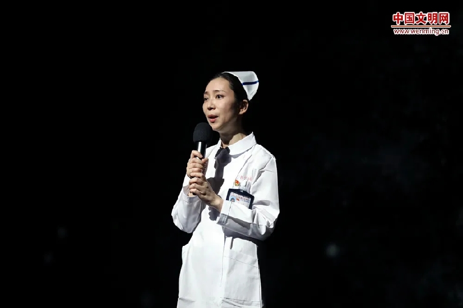 華東醫(yī)院外科重癥監(jiān)護(hù)室護(hù)士長、上海第一批援鄂醫(yī)療隊(duì)隊(duì)員陳貞現(xiàn)場(chǎng)講述“抗疫”故事。中國文明網(wǎng) 趙洋 攝