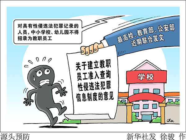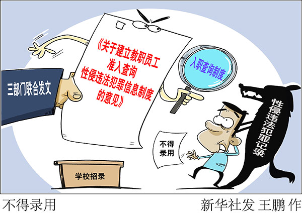 新華社北京9月18日電(記者陳菲)為加強(qiáng)對(duì)性侵未成年人犯罪的源頭預(yù)防,最高檢、教育部、公安部近期聯(lián)合發(fā)文,要求在全國建立入職查詢制度,對(duì)具有性侵違法犯罪記錄的人員,中小學(xué)校、幼兒園不得錄用,教師認(rèn)定機(jī)構(gòu)不得認(rèn)定教師資格。