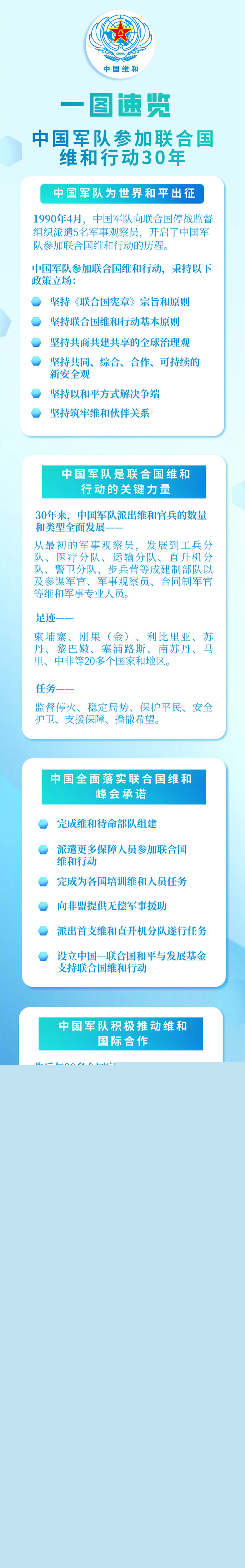 30年來(lái),中國(guó)軍隊(duì)始終認(rèn)真踐行《聯(lián)合國(guó)憲章》宗旨和原則,堅(jiān)定支持聯(lián)合國(guó)在維和行動(dòng)中的主導(dǎo)地位,支持聯(lián)合國(guó)通過(guò)改革構(gòu)建更加完善的維和行動(dòng)體系。