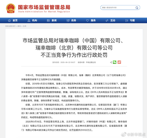 2020年9月18日,市場(chǎng)監(jiān)管總局及上海、北京市場(chǎng)監(jiān)管部門,對(duì)瑞幸咖啡(中國(guó))有限公司、瑞幸咖啡(北京)有限公司及北京車行天下咨詢服務(wù)有限公司、北京神州優(yōu)通科技發(fā)展有限公司、征者國(guó)際貿(mào)易(廈門)有限公司等45家涉案公司作出行政處罰決定,處罰金額共計(jì)6100萬元。