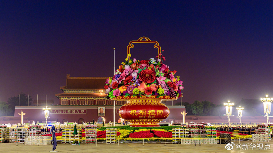 據(jù)悉,大花籃以喜慶的花果籃為主景,花籃為鋼架結(jié)構(gòu),籃身為玻璃鋼材質(zhì),籃盤直徑12米,花壇底部直徑45米。在籃體南側(cè)書寫“祝福祖國(guó),1949-2020”字樣,在籃體北側(cè)書寫 “萬(wàn)眾一心,1949-2020”字樣?;@內(nèi)共使用了125枝大型仿真花,籃底部花壇則使用我國(guó)自育花園小菊“絢秋星光”與一品紅組成10顆紅心的圖案。