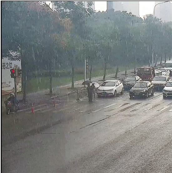 當(dāng)老人好不容易快走到馬路對面時(shí),天公不作美,突然下起瓢潑大雨,又一幕感人的瞬間出現(xiàn)了:一輛等候通行的小轎車上下來一名女司機(jī),從后備廂拿出一把雨傘后,快步跑上前,遞到老人手里。