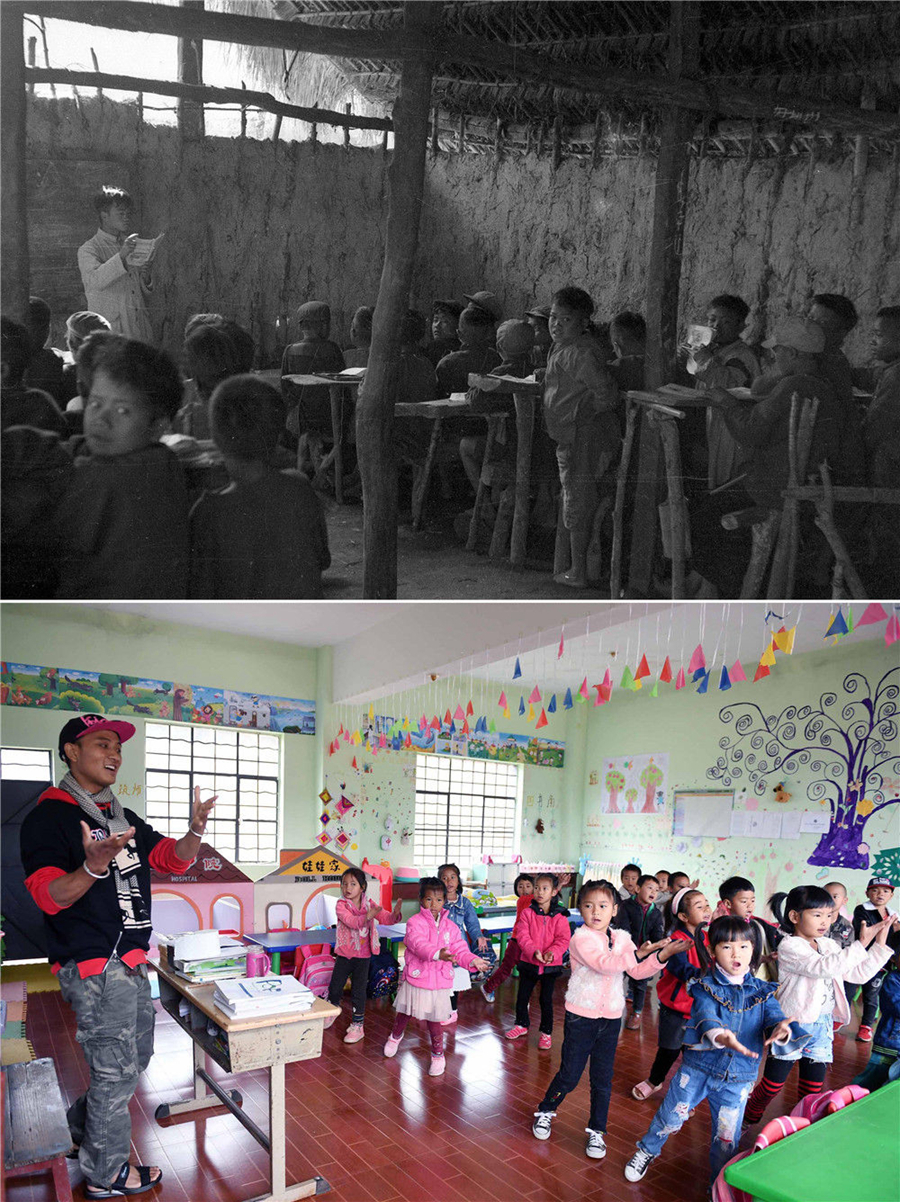 拼版照片:上圖為1954年,在云南省普洱市西盟佤族自治縣創(chuàng)辦的第一所小學(xué)——西盟小學(xué),老師帶領(lǐng)孩子讀書學(xué)習(xí)(資料照片);下圖為2018年12月7日,云南省普洱市西盟佤族自治縣勐梭鎮(zhèn)班母村佤山育忠幼兒園的孩子跟著老師巖科上音樂課。1986年出生的巖科是班母村佤族寨人。他說(shuō),我的阿媽小時(shí)候沒有進(jìn)過(guò)一天學(xué)堂,現(xiàn)在,佤山的孩子們都在寬敞明亮的教室里學(xué)習(xí)(新華社記者楊宗友攝)。新華社發(fā)
