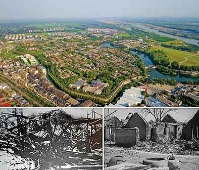 拼版照片:上圖為8月17日無人機(jī)航拍臺兒莊古城全貌(新華社記者郭緒雷攝);下兩圖為1938年臺兒莊大戰(zhàn)后古城廢墟(資料照片)。