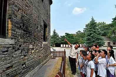 在臺兒莊大戰(zhàn)遺址公園彈孔墻前,作家時(shí)培京(左一)給孩子講述歷史(8月19日攝)。新華社記者郭緒雷攝