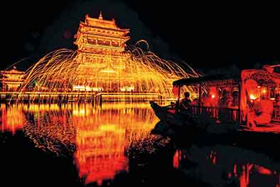 在臺兒莊古城,游客坐在船上觀看打鋼花非遺表演(8月20日攝)。新華社記者郭緒雷攝