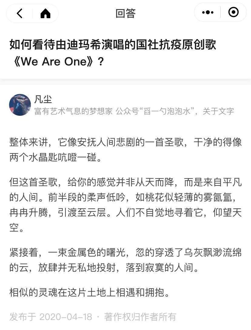 @Monstristing:歌聲有激勵(lì)磅礴的氣勢(shì),又兼具一絲絲的溫柔,吟唱鋪展開星辰大海的浩瀚,真是美妙。聽完感覺元?dú)鉂M滿,祖國母親生日快樂!