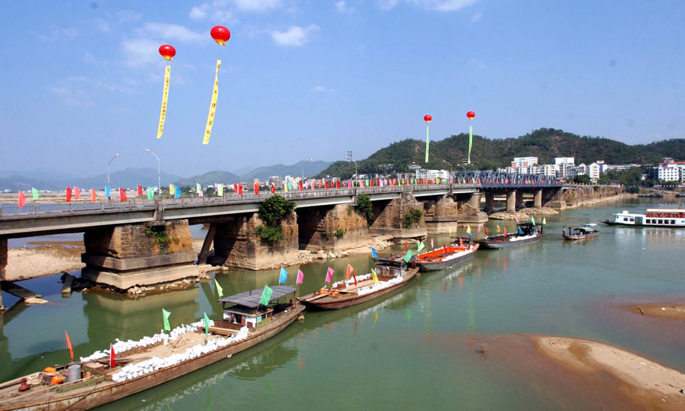 ↑?2007年重修中的廣濟橋和中段“十八梭船”啟閉式浮橋