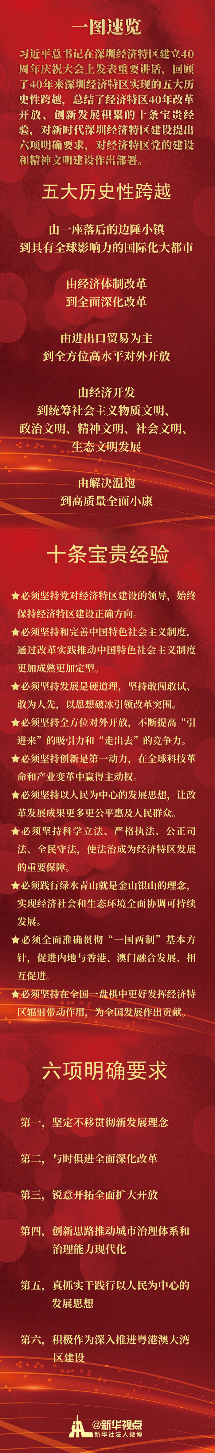 習(xí)近平總書記在深圳經(jīng)濟(jì)特區(qū)建立40周年慶祝大會(huì)上發(fā)表重要講話,回顧了40年來深圳經(jīng)濟(jì)特區(qū)實(shí)現(xiàn)的五大歷史性跨越,總結(jié)了經(jīng)濟(jì)特區(qū)40年改革開放、創(chuàng)新發(fā)展積累的十條寶貴經(jīng)驗(yàn),對(duì)新時(shí)代深圳經(jīng)濟(jì)特區(qū)建設(shè)提出六項(xiàng)明確要求,對(duì)經(jīng)濟(jì)特區(qū)黨的建設(shè)和精神文明建設(shè)作出部署。