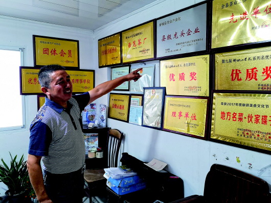 舒城縣五顯鎮(zhèn)石關(guān)蘭花茶葉專業(yè)合作社負(fù)責(zé)人龔世存向記者展示合作社獲得的榮譽(8月29日攝)。