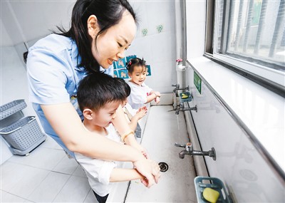 9月24日,浙江省湖州市吳興區(qū)織里鎮(zhèn)衛(wèi)生院的醫(yī)護(hù)人員教織北幼兒園的孩子們正確的洗手步驟。新華社記者 徐 昱攝
