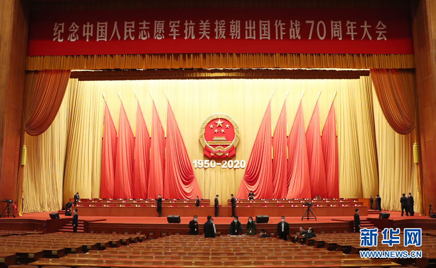 ??? 10月23日,紀(jì)念中國人民志愿軍抗美援朝出國作戰(zhàn)70周年大會在北京人民大會堂隆重舉行。圖為人民大會堂大禮堂。(新華網(wǎng) 翟子赫 攝)