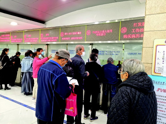 此時(shí),這家醫(yī)院唯一一個(gè)現(xiàn)場掛號(hào)的窗口——面向70周歲以上老年人的窗口,已經(jīng)排起了長隊(duì)。老人們一個(gè)比一個(gè)來得早,仍有點(diǎn)兒神色緊張。