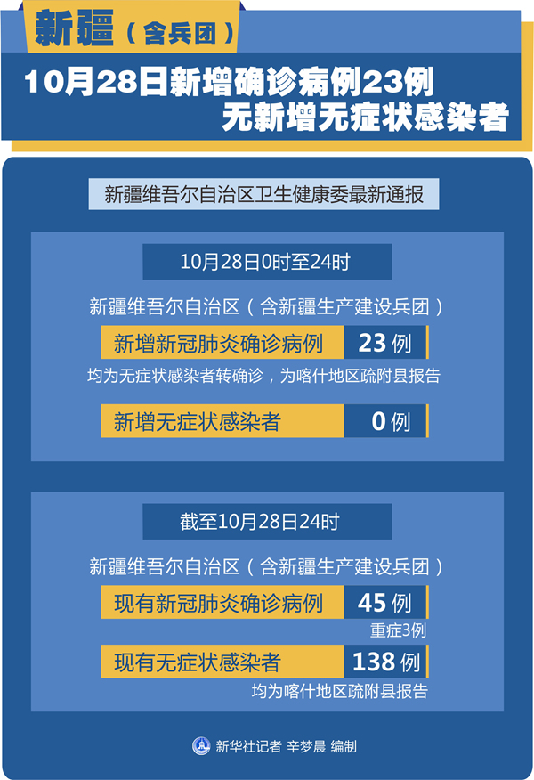 截至10月28日24時(shí),新疆(含兵團(tuán))現(xiàn)有確診病例45例(重癥3例),無癥狀感染者138例,均為喀什地區(qū)疏附縣報(bào)告。