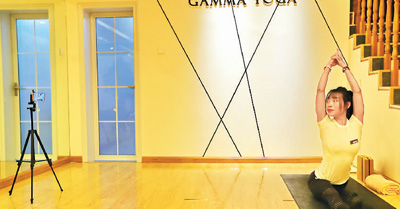 位于河北省秦皇島市海港區(qū)的一家瑜伽會所內(nèi),瑜伽教練正在通過直播的方式為學員講解課程。曹建雄攝(人民視覺)