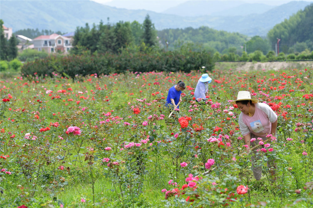 在江西省修水縣黃沙鎮(zhèn)湯橋村的易地扶貧搬遷安置點,村民在花卉種植基地里勞作(5月20日攝)。新華社記者 彭昭之 攝