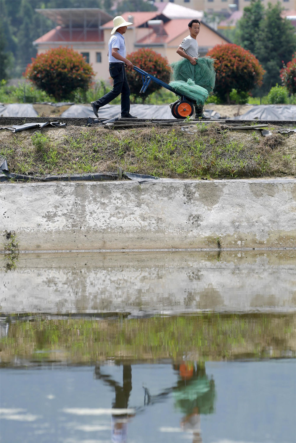 在江西省修水縣黃沙鎮(zhèn)湯橋村,返鄉(xiāng)創(chuàng)業(yè)大學(xué)生李平(右)和水產(chǎn)合作社的工作人員準備去放對蝦蝦苗。他創(chuàng)辦的水產(chǎn)合作社幫助周邊村民就業(yè)(5月20日攝)。新華社記者 彭昭之 攝