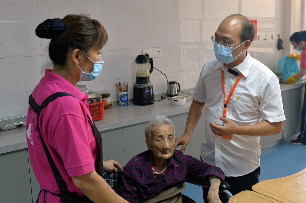 老年人能力評(píng)估師王帝權(quán)(右)在和護(hù)理人員交流老人的飲食狀況 新華社記者 戚曉毅 攝