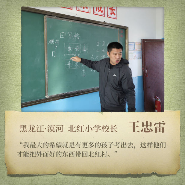 這所位于黑龍江省漠河市北極鎮(zhèn)北紅村的北紅小學只有兩位老師、3個年級和11名學生?!?0后”校長王忠雷每天在數(shù)學、體育、思想品德三個科目中“周旋”。打開課件,他向?qū)W生熟練講授“體積與容積”相關(guān)知識的時候,隔壁教室傳來妻子于晶的語文課上孩子們瑯瑯的讀書聲……