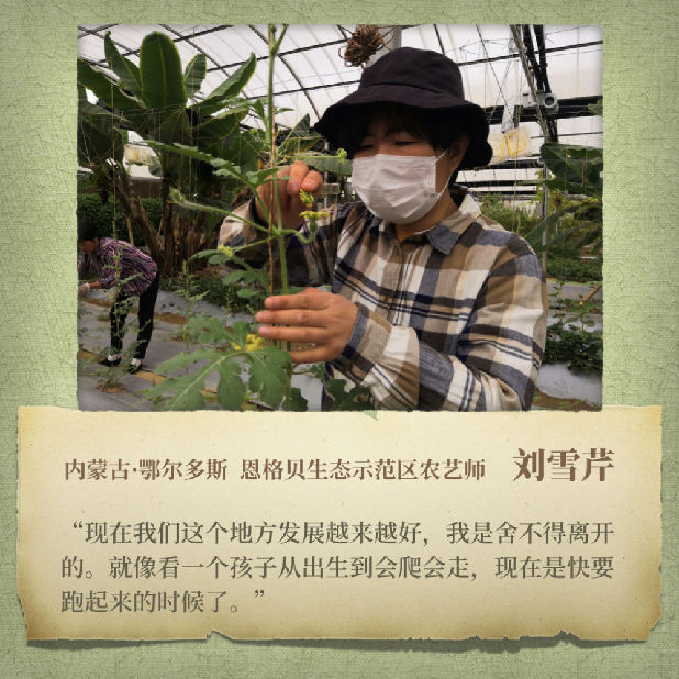 2009年初,大學畢業(yè)剛半年的劉雪芹來到恩格貝。彼時,面對有技術(shù)門檻的設(shè)施農(nóng)業(yè),當?shù)貛缀鯖]有熟練工人,種植、育苗都需要劉雪芹手把手教。草業(yè)科學專業(yè)畢業(yè)的劉雪芹克服著環(huán)境、氣候等困難,同時也懂得借助自然的力量。