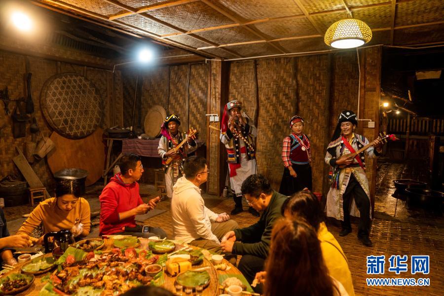 在怒江州福貢縣匹河怒族鄉(xiāng)老姆登村,怒族群眾郁五林(后排右三)在自家開的農家樂給客人表演民族歌舞(11月2日攝)。新華社記者 胡超 攝