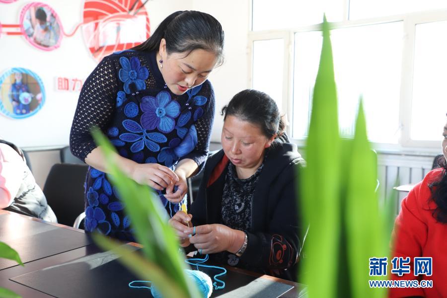 10月29日,在黑龍江省鶴崗市綏濱縣忠仁鎮(zhèn)黎明村的編織工作室,李明鴿(左)輔導(dǎo)村民做手工編織。新華社記者 徐凱鑫 攝