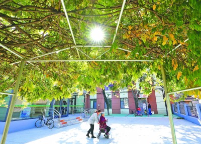 河北唐山市路北區(qū)煤研分院社區(qū)幸福家園養(yǎng)老服務中心,工作人員陪護一位老人在院內活動。新華社發(fā)