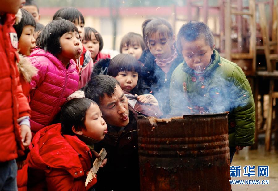 在江西省鷹潭市余江區(qū)春濤鎮(zhèn)黃泥村黃泥小學(xué),老師章站亮(前右)和學(xué)生們一起生火(2019年1月3日攝)。由于生火用的材料均是廢棄的桌椅或者枯葉,點(diǎn)火后得不停用嘴吹氣才能燒得旺盛。新華社記者 胡晨歡 攝