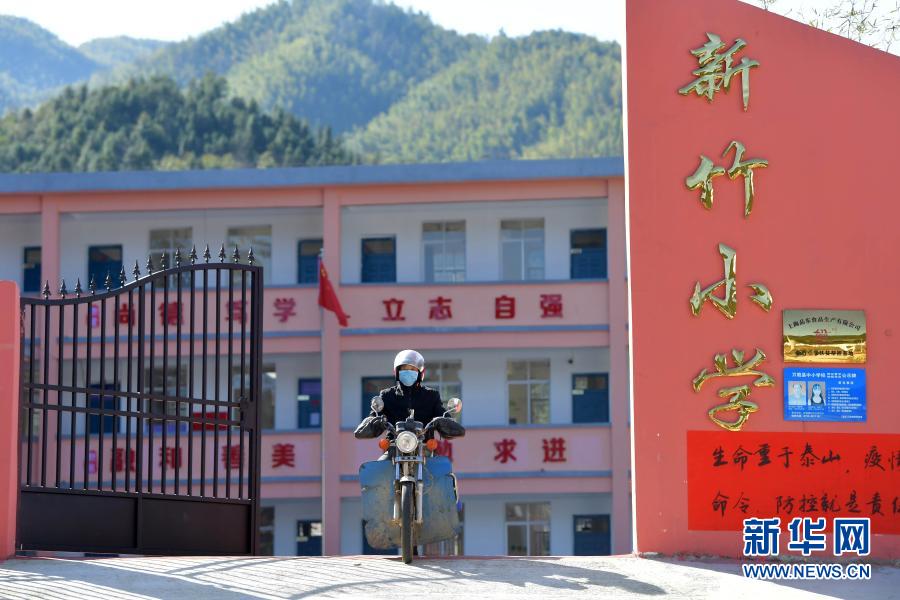 在江西省萬(wàn)載縣高村鎮(zhèn)新竹村新竹小學(xué),校長(zhǎng)羅長(zhǎng)石帶著拷貝了當(dāng)日線上教育課程的U盤和新學(xué)期的書本,準(zhǔn)備前往住在山里偏遠(yuǎn)村組的幾位學(xué)生家里(2月17日攝)。新華社記者 彭昭之 攝