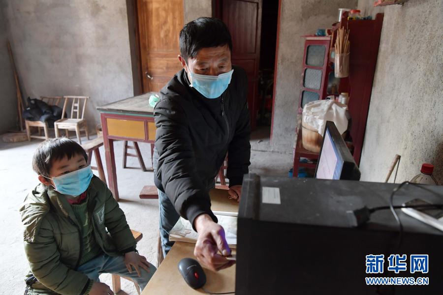 在江西省萬(wàn)載縣高村鎮(zhèn)新竹村尹家?guī)X村組,新竹小學(xué)的校長(zhǎng)羅長(zhǎng)石在學(xué)生郭仕錢家中,為他拷貝當(dāng)天的課程(2月17日攝)。新華社記者 彭昭之 攝